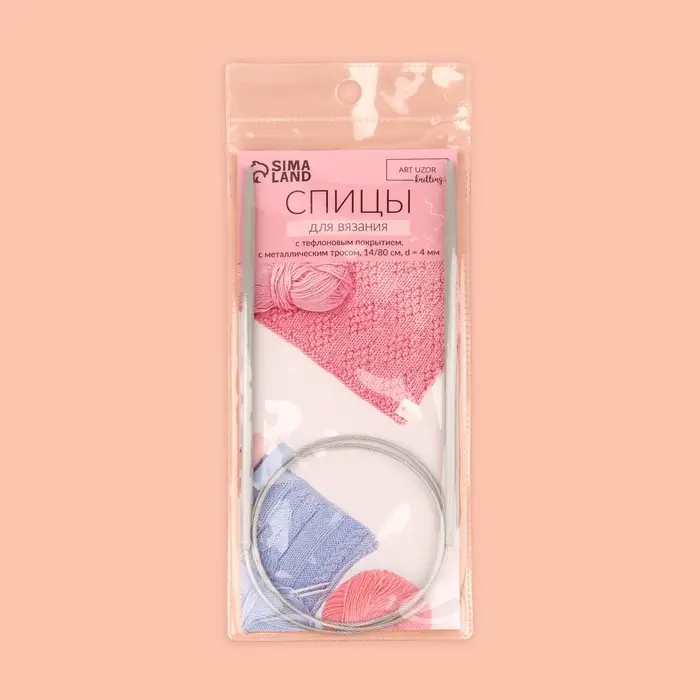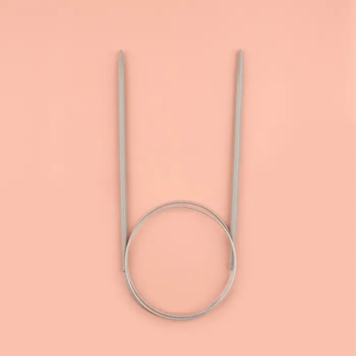 Круговые спицы представляют собой две металлические части, соединённые друг с другом тросиком. Инструмент незаменим при вязании полотна по кругу. С его помощью получаются изделия без дополнительных швов: шапки, рукава и горловины.