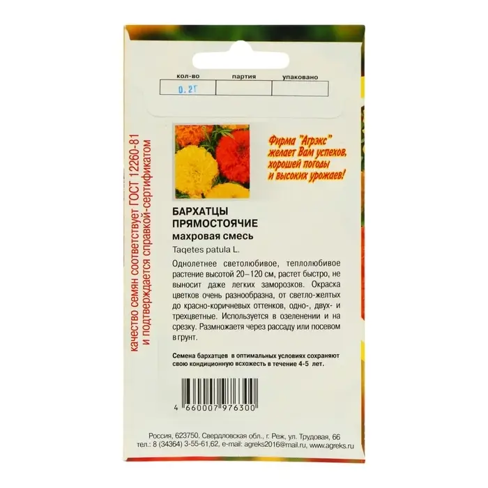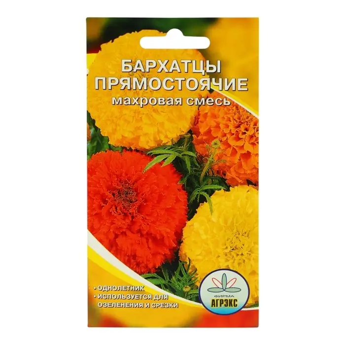 Семена цветов однолетние Бархатцы прямостоячие смесь махровая 0,2 гр.