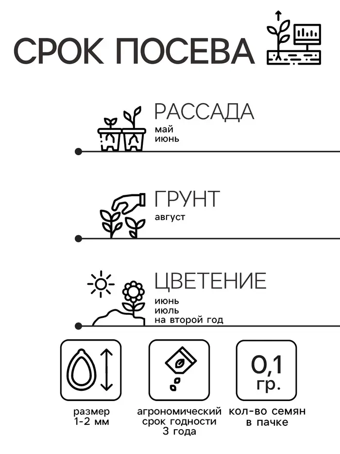 Посев в мае, июне. Глубина посева 0,5 см. Высадка рассады:август.