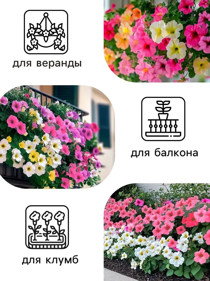 Впечатляющий дуэт обильно цветущих петуний для вертикального озеленения. Молодые кустики прямостоячие. Побеги достаточно быстро отрастают и свешиваются через края контейнеров, образуя пышные ниспадающие каскады до 50-60 см длиной. Цветки крупные, Ø 7-9 см. Растения неприхотливые, хорошо переносят неблагоприятные погодные условия в виде дождя и ветра, устойчивые к жаре. Бесподобно смотрятся в подвесных корзинах, балконных ящиках и высоких вазах.