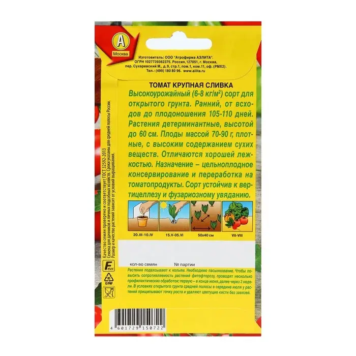 Высокоурожайный сорт, предназначен для переработки и консервирования. Сорт скороспелый. Период от появления массовых всходов до созревания плодов составляет 105-110 дней. Растение детерминантное, высотой 35-60 см. Плоды сливовидные, красные, массой 70-90 г. Сорт обладает повышенной устойчивостью к фитофторозу, устойчив к вертициллезному увяданию и фузариозу. Плотные, мясистые плоды не лопаются при консервировании и имеют отличный товарный вид как в свежем, так и в консервированном виде. Рекомендуется для выращивания в открытом грунте.