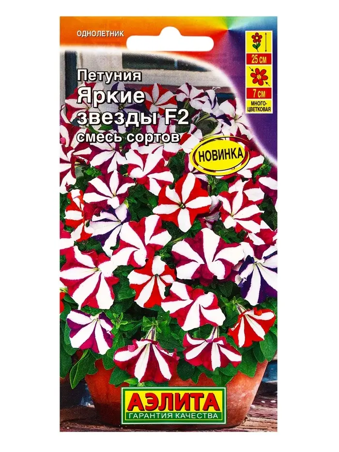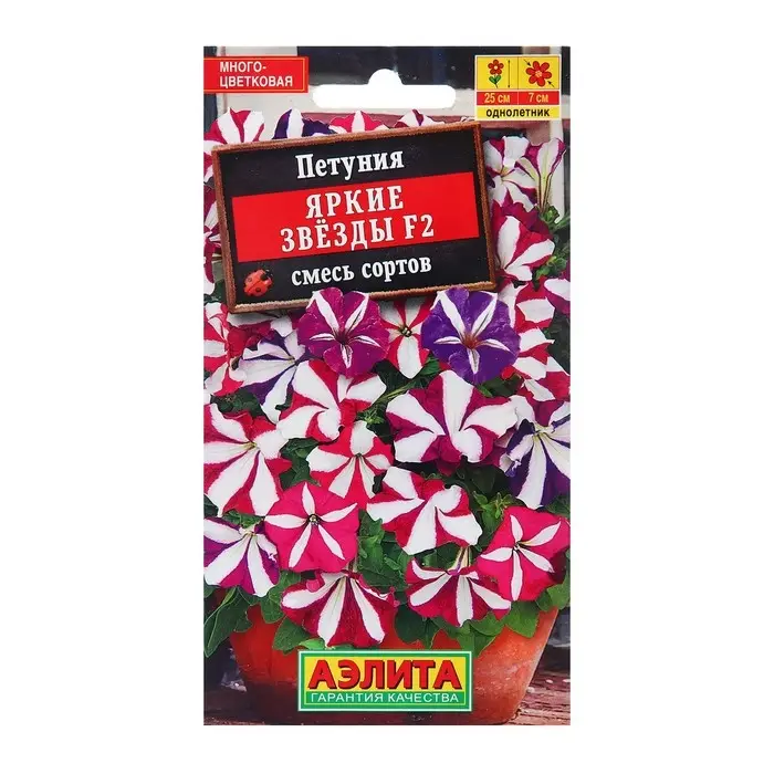Великолепная смесь многоцветковых петуний, которая объединяет все звездные расцветки. Растения образуют очень красивую компактную форму куста, высотой до 25 см. Цветки очень насыщенного яркого цвета Ø 5-7 см. Петунии данной смеси обладают отличными характеристиками – обильно и продолжительно цветут, не требует формировки, очень легки в уходе и устойчивы к неблагоприятным условиям. Рекомендуется использовать для создания цветников, выращивания на балконах и лоджиях.
