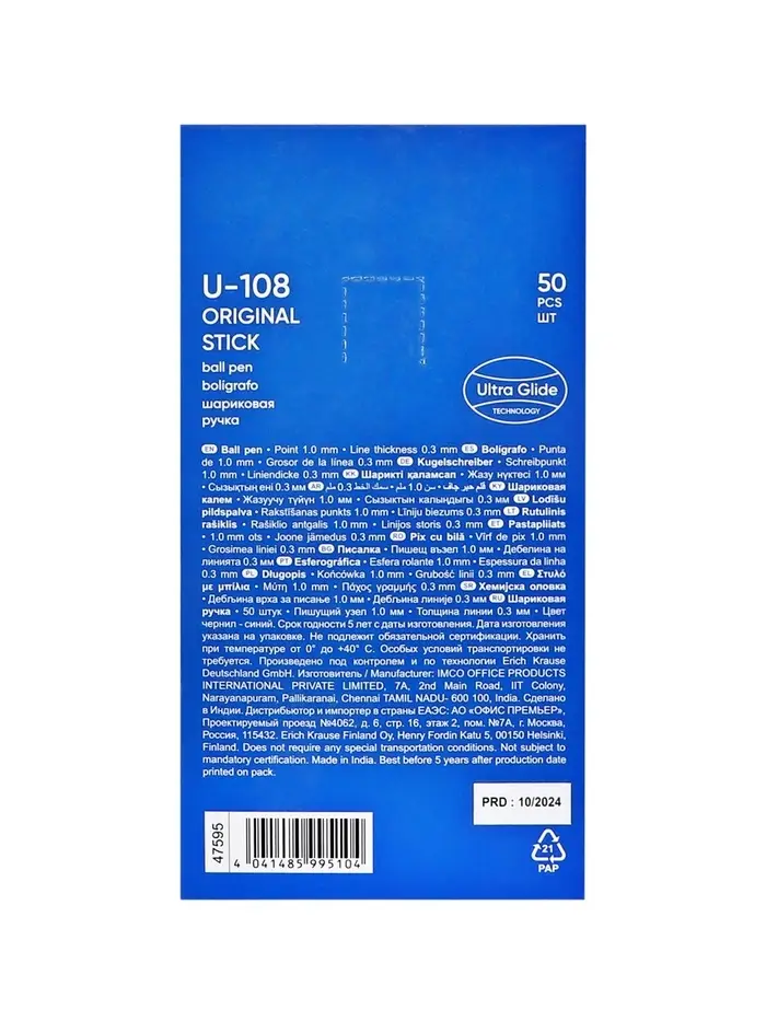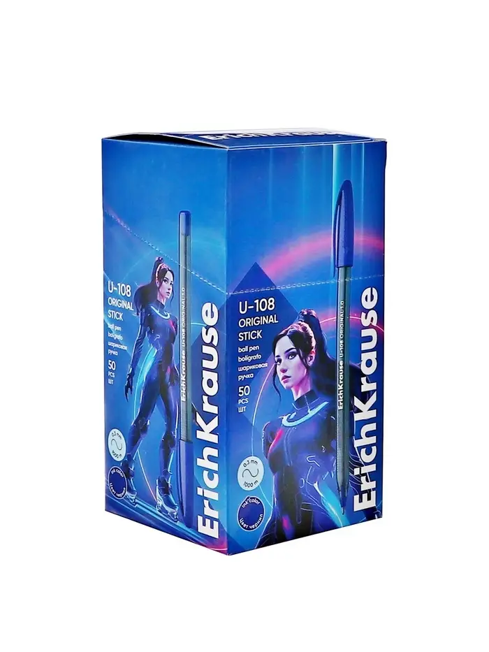 Ручка шариковая ErichKrause U-108 Original Stick, узел 1.0 мм, чернила синие, супермягкое письмо, длина линии письма 1000 метров