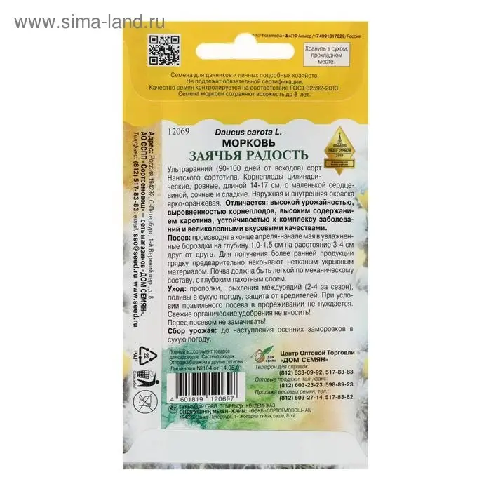 Ультраранний (90-100 дней от всходов) сорт Нантского сортотипа. Корнеплоды цилиндрические, ровные, длиной 14-17 см, с маленькой сердце виной, сочные и сладкие. Наружная и внутренняя окраска. ярко-оранжевая. Отличается: высокой урожайностью, выровненностью корнеплодов, высоким содержанием каротина, устойчивостью к комплексу заболеваний и великолепными вкусовыми качествами.