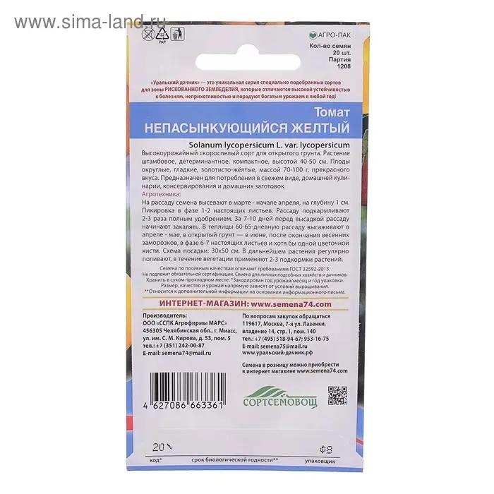Семена Томат "Непасынкующийся Желтый", детерминантный, низкорослый, 20 шт