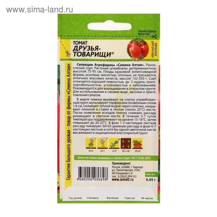 Селекция Агрофирмы «Семена Алтая». Раннеспелый сорт. Растение штамбовое, детерминантное, высотой 75-95 см. Плоды красивой эллипсовидной формы, розовые, мясистые, плотные, не трескаются, отличных вкусовых качеств, массой 132-350 г. Сорт отличается хорошей лежкостью, до 3-х недель, транспортабельностью, устойчивостью к заболеваниям. Рекомендуется для выращивания в открытом грунте. Для использования в свежем виде, засолки и приготовления салатов.