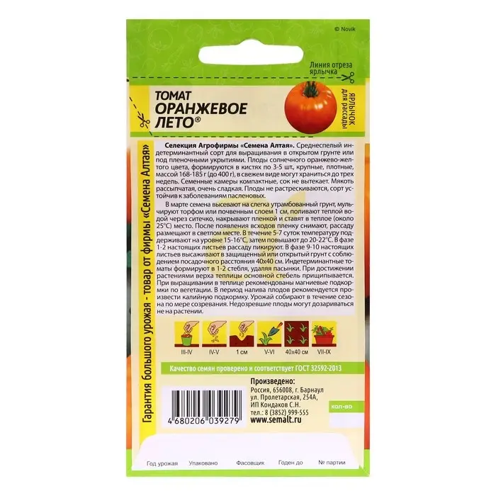 Селекция Агрофирмы «Семена Алтая». Крупноплодный, среднеспелый, индетерминантный сорт. Плоды солнечного оранжево-желтого цвета, плотные, сладкие, в свежем виде могут храниться до трех недель. Масса плодов 168-185 г (до 400 г). Не трескается, устойчив к заболеваниям. Выращивать можно в открытом грунте или под пленочным укрытием.