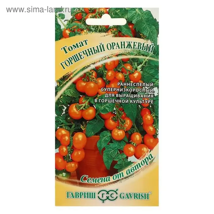 Раннеспелый (80-90 дней от всходов до плодоношения) супердетерминантный сорт (до 25 см). Рекомендуется для выращивания в открытом грунте, под временным укрытием и в горшечной культуре. Длина листа 21 см, соцветия простые и промежуточные (однократно разветвленные), компактные, длиной 12-15 см. Плоды 2-3 камерные, округлой формы, слегка вытянутые, оранжевой окраски, массой 30-75 г. Идеальны для засолки и цельноплодного консервирования, используются для приготовления свежих салатов. Посев на рассаду в марте — начале апреля. Пикировка рассады в фазе первого настоящего листа. Посадка рассады в грунт — начало-середина мая или конец мая – начало июня. Урожайность до 1,5 кг/растение.