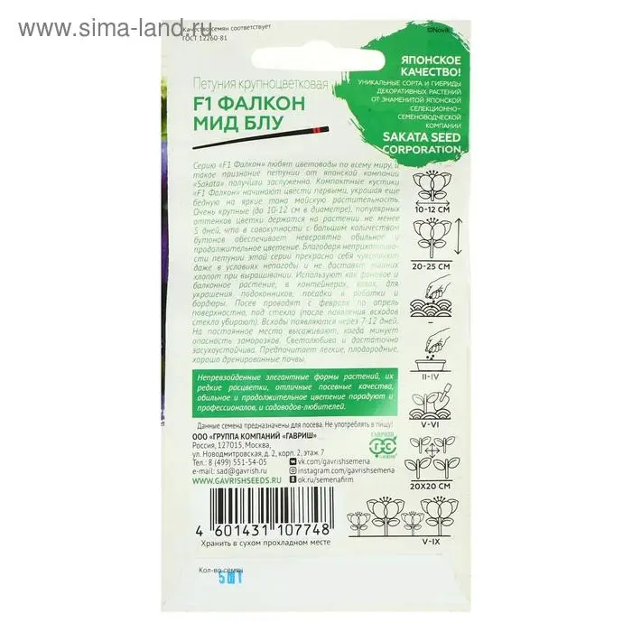 Серию «F1 Фалкон» любят цветоводы по всему миру и такое признание петунии от японской компании «Sakata» получили заслуженно. Компактные кустики «F1 Фалкон» первые начинают цвести, украшая еще бедную на яркие тона майскую растительность. Очень крупные (до 10-12 см в диаметре) популярных оттенков, держатся на растении не менее 5 дней, что в совокупности с большим количеством бутонов, обеспечивает невероятно обильное и продолжительное цветение. Благодаря неприхотливости петунии этой серии прекрасно себя чувствуют, даже в условиях непогоды и не доставят лишних хлопот при выращивании. Используют как фоновое и балконное растение, в контейнерах, вазах, для украшения подоконников, для посадки в рабатки и бордюры. Посев проводят с февраля по апрель, поверхностно, под стекло (после появления всходов стекло убирают). Всходы появляются через 7-12 дней. На постоянное место высаживают, когда минует опасность заморозков. Светолюбива и достаточно засухоустойчива. Предпочитает легкие, плодородные, хорошо дренированные почвы.