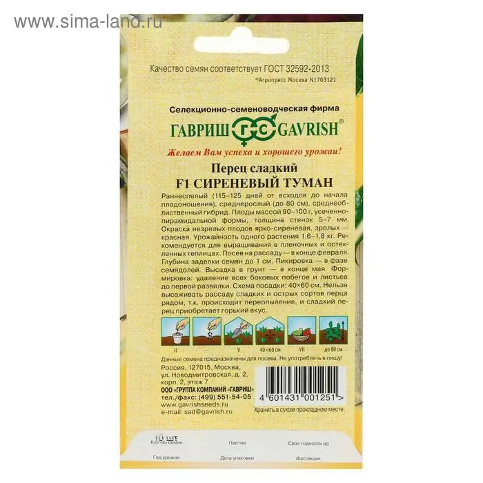 Среднеранний (115-125 дней от всходов до начала плодоношения), среднерослый (до 80 см), среднеоблиственный гибрид. Плоды массой 90-100 г, усечено-пирамидальной формы, толщина стенок 5-7 мм. Окраска плодов в технической спелости - ярко-сиреневая, при созревании - красная. Рекомендуется для выращивания в пленочных и остекленных теплицах. Посев на рассаду в конце февраля. Пикировка в фазе семядолей. Высадка в грунт в конце мая. Формировка: удаление всех боковых побегов и листьев до первой развилки. Схема посадки 40x60 см. Урожайность одного растения 1,6-1,8 кг.