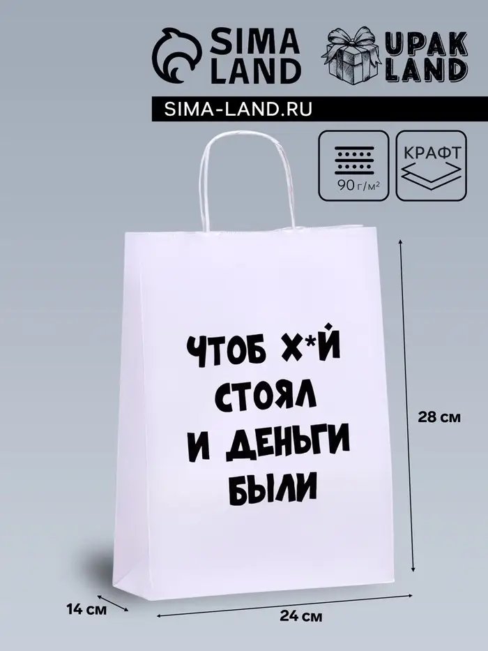 Подарок с мужским характером! Крафт-пакет с провокационной надписью — оригинальная упаковка для тех, кто ценит острый юмор. Плотная крафт-бумага с кручёным шпагатом выдерживает до 3 кг, а смелая фраза добавит пикантности вашему презенту.