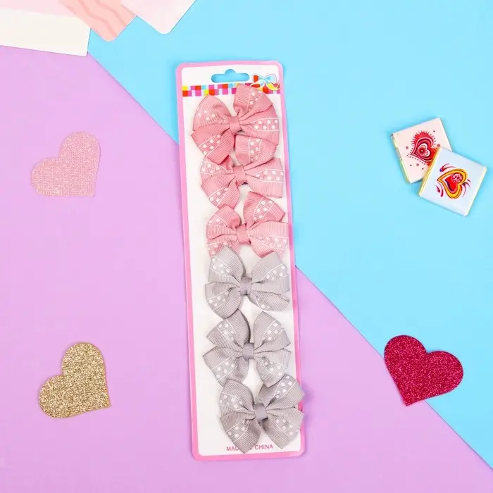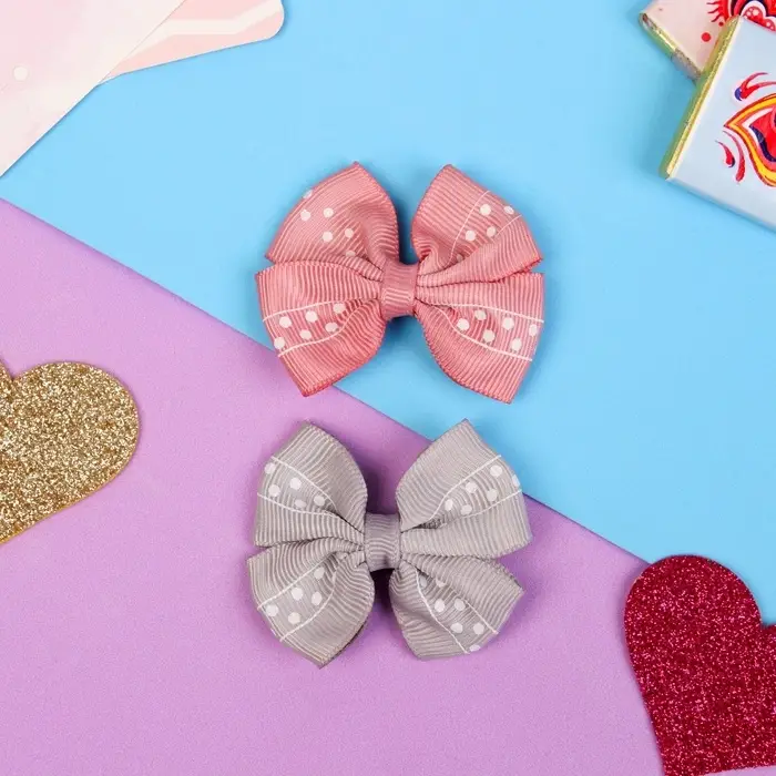 Зажим для волос "Бантик" полоса в горошек, 5,5 см, серый и розовый