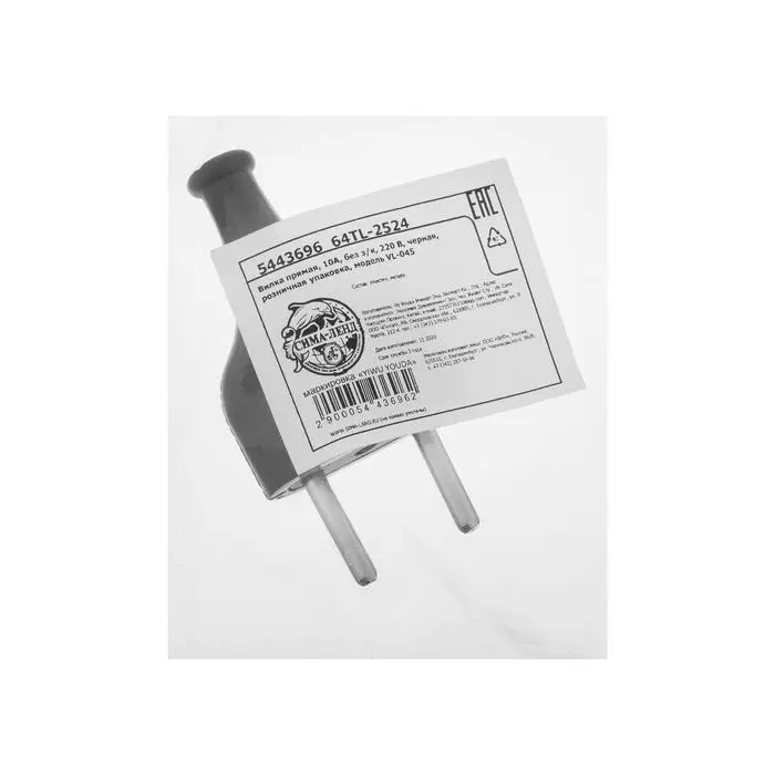 Вилка прямая, 10А, без з/к, 220 В, черная, розничная упаковка