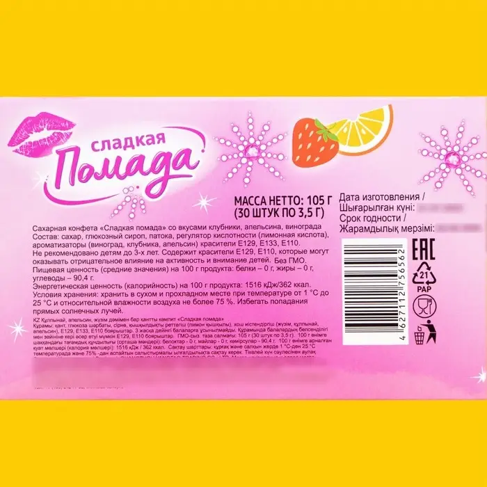 Отлично подходит для подарков, угощений на праздниках или в качестве комплимента для друзей и близких. Сахарная конфета «Сладкая помада» добавит нотку веселья и создавать яркие моменты в вашей жизни!