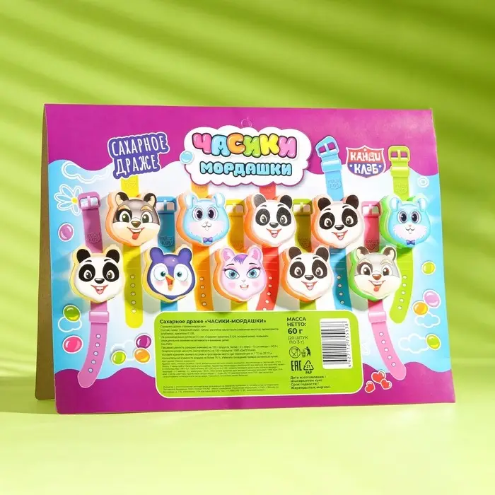 Оригинальная детская сладость Канди Клаб Часики-Мордашки в виде детских часов с забавными мордашками животных со сладкими конфетками драже с клубничным вкусом внутри - прекрасный подарок детям, который можно взять с собой на прогулку, в поездку, в детский сад или школу. В упаковке находится сразу 20 часиков по 3 гр. Используйте необычную сладость для украшения стола или развлечения детей на вечеринке, дне рождении или любом другом празднике. Не содержит ГМО, жиров, трансжиров, консервантов в составе. Можно давать детям от трех лет. Оригинальный детский десерт Канди Клаб исключает наличие в составе некачественных компонентов.