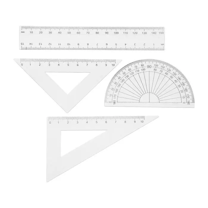 Набор чертежный 4 предмета (линейка 15 см, треугольник11 см/ 30*и 5 см/ 45*, транспортир) прозрачный