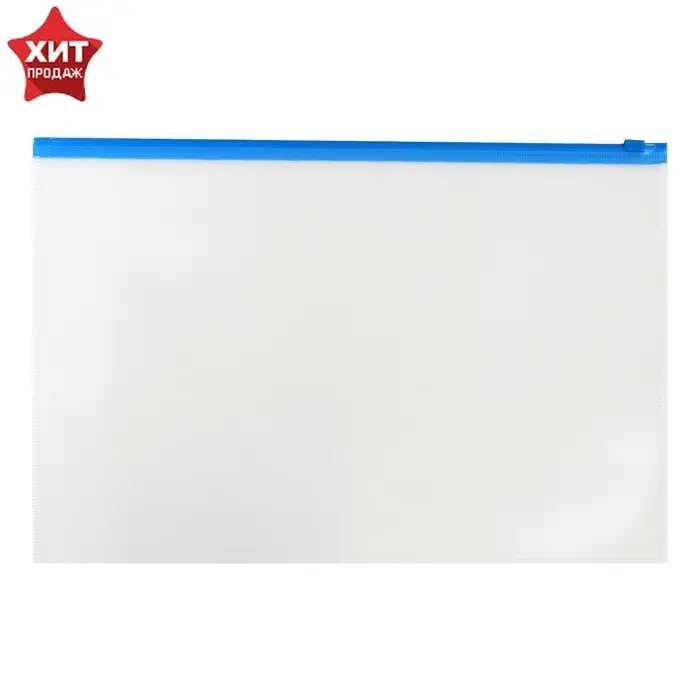 Изготовлена из прочного прозрачного пластика толщиной 150 мкм с гладкой фактурой. Формат А4 (333х230 мм). Герметичная застежка-зиплок защищает документы от механических повреждений, а также пыли и влаги. Цвет молнии – синий.
