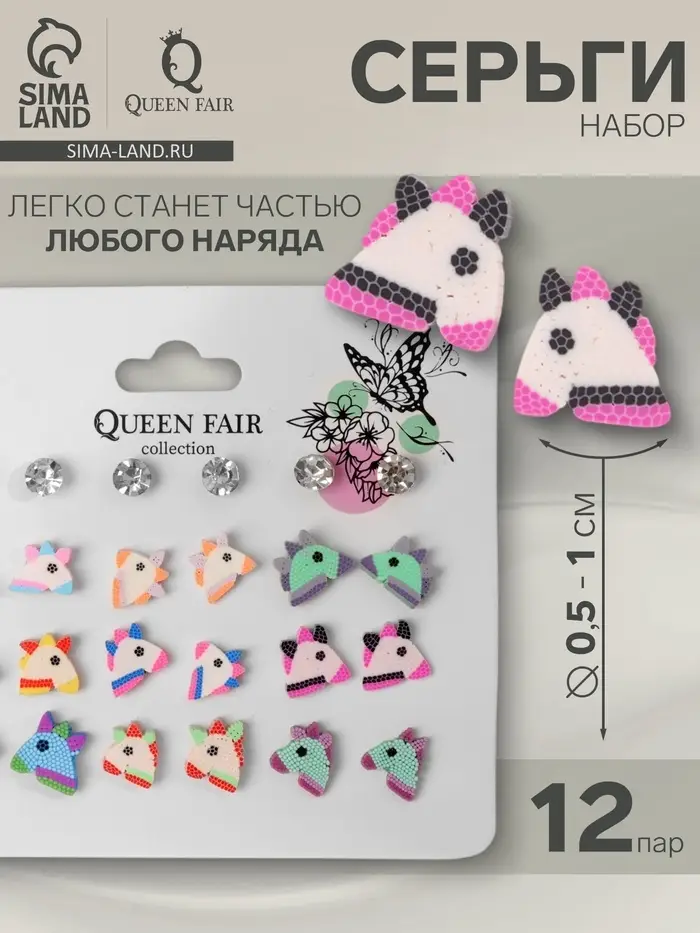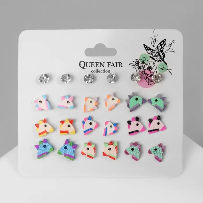 Серьги пусеты QF «Единороги милашки»,12 пар, цветные в серебре
