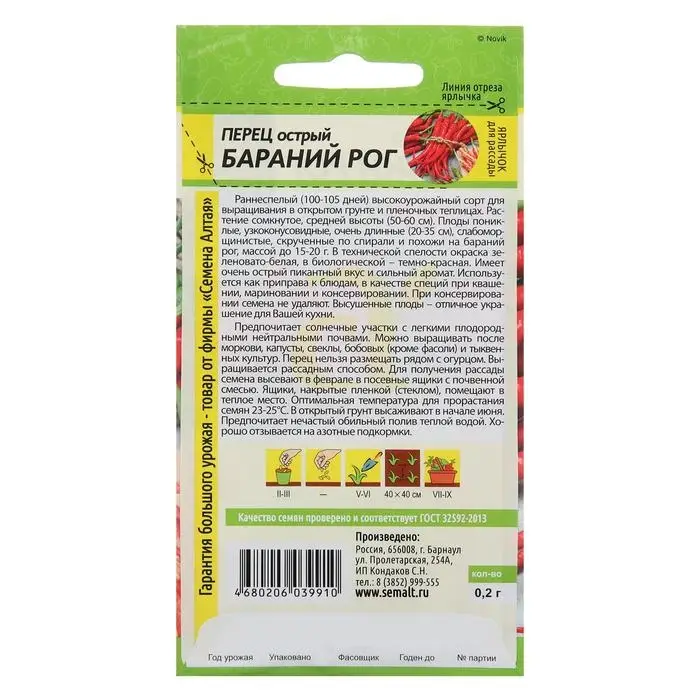 Раннеспелый (100-105 дней) высокоурожайный сорт для выращивания в открытом грунте и пленочных теплицах. Растение сомкнутое, средней высоты (50-60 см). Плоды пониклые, узкоконусовидные, очень длинные (20-35 см), слабоморщинистые, скрученные по спирали и похожи на бараний рог массой до 15-20 г. В технической спелости окраска зеленовато-белая, в биологической – темно-красная. Имеет очень острый пикантный вкус и сильный аромат. Используется как приправа к блюдам, в качестве специй при квашении, мариновании и консервировании. При консервировании семена не удаляют. Высушенные плоды - отличное украшение для Вашей кухни. Предпочитает солнечные участки с легкими плодородными нейтральными почвами. Можно выращивать после моркови, капусты, свеклы, бобовых (кроме фасоли) и тыквенных культур. Перец нельзя размещать рядом с огурцом. Выращивается рассадным способом. Для получения рассады семена высевают в феврале в посевные ящики с почвенной смесью. Глубина заделки не более 1 см. Ящики, накрытые пленкой (стеклом), помещают в теплое место. Оптимальная температура для прорастания семян 23-25°С. В открытый грунт высаживают в начале июня. Посадочный интервал 40х40 см. Предпочитает нечастый обильный полив теплой водой. Хорошо отзывается на азотные подкормки.