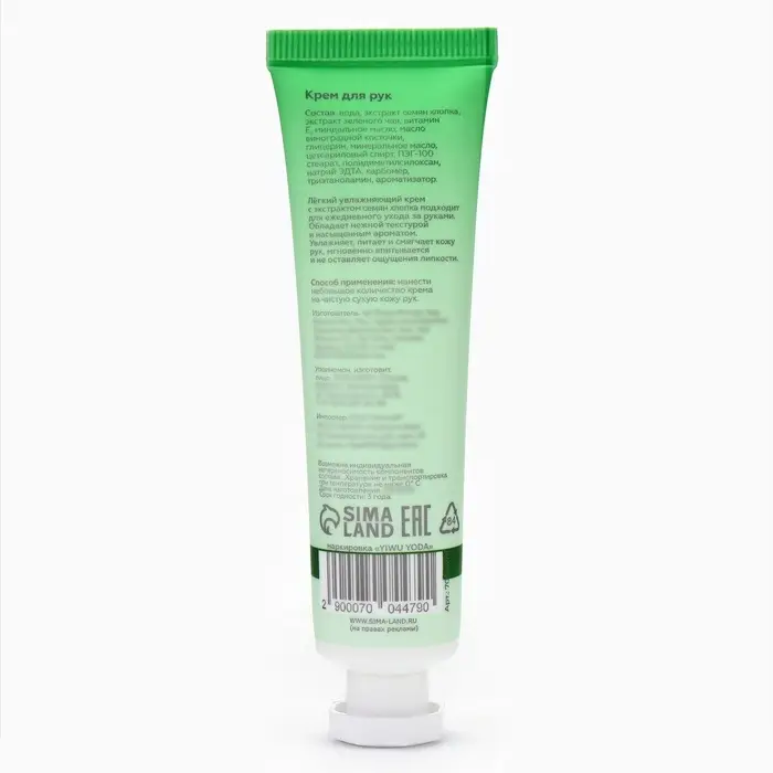 Состав: вода, экстракт зеленого чая, глицерин, минеральное масло, цетеариловый спирт, ПЭГ-100 стеарат, полидиметилсилоксан, натрий ЭДТА, карбомер, триэтаноламин, метилпарабен, пропилпарабен, ароматизатор хлопка.