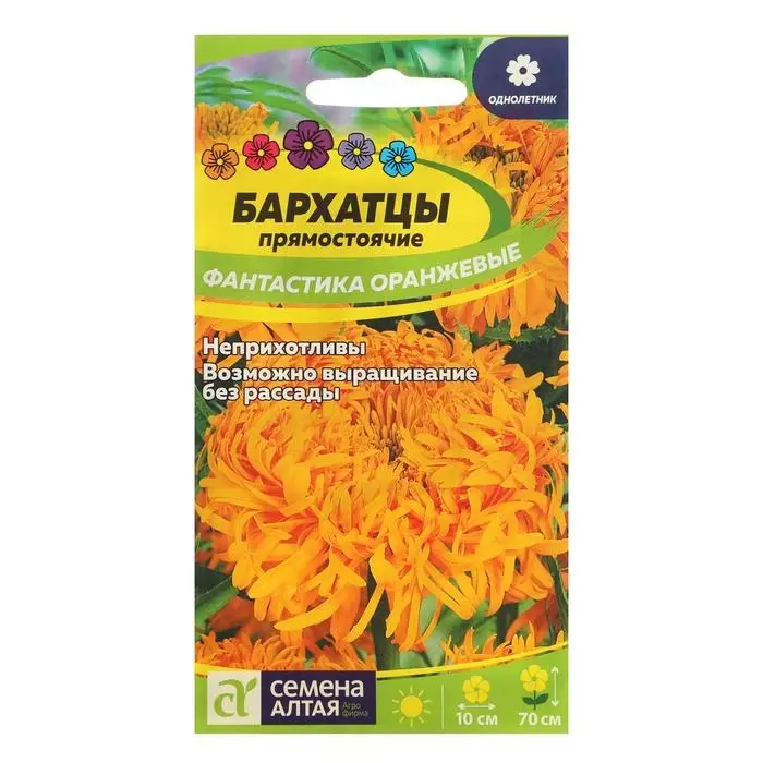 Великолепный сорт высокорослых бархатцев, выделяющийся крупными, исключительными по своей красоте и оригинальности, соцветиями. Растение формирует прямостоячий куст высотой до 70 см, который устойчив к непогоде и полеганию. Соцветия крупные ярко-оранжевые, махровые. Сорт особенно рекомендуется для создания высоких бордюров, рабаток и срезки.Неприхотливое, засухоустойчивое и светолюбивое растение, выносит небольшое затенение. Заморозков не переносит. Наибольшей декоративности достигает на открытых солнечных участках с питательными нейтральными суглинистыми почвами. Посев семян на рассаду проводят в марте. Глубина заделки семян 0,5 см. Посевы накрывают плёнкой для поддержания необходимого уровня влажности. При температуре +20-22°С всходы появляются через 7-14 дней, затем пленку убирают, температуру понижают до +16-18°С, во избежание вытягивания рассады. Когда минует угроза возвратных заморозков проводят высадку в открытый грунт. Схема посадки 30х50 см. Цветение – через 2-2,5 месяца от посева. В районах с мягким климатом возможен посев семян в открытый грунт в мае на глубину 1,0-1,5 см.
