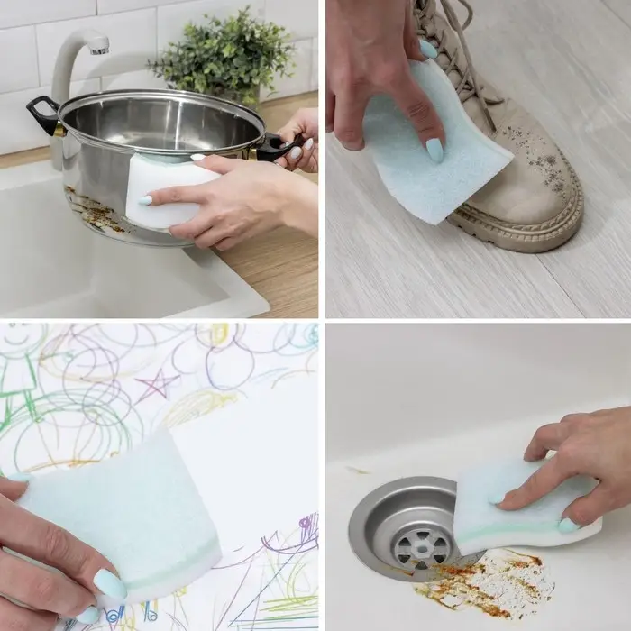 - Меланиновая губка легко удалит налет и пятна ржавчины, жирных пятен, плесени.