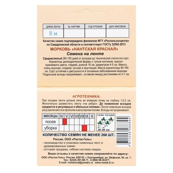 Семена Морковь "НАНТСКАЯ КРАСНАЯ", 260 шт, ЛЕНТА 8 М