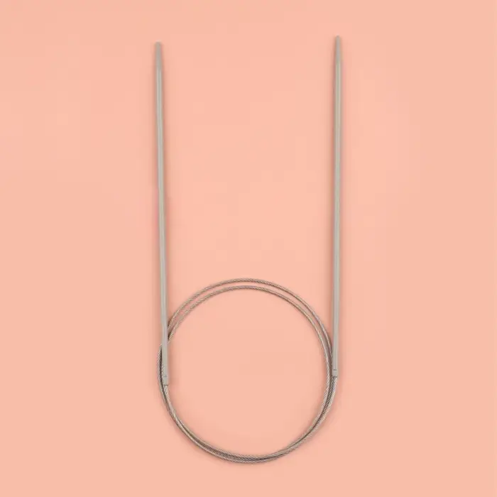 Круговые спицы представляют собой две металлические части, соединённые друг с другом тросиком. Инструмент незаменим при вязании полотна по кругу. С его помощью получаются изделия без дополнительных швов: шапки, рукава и горловины.