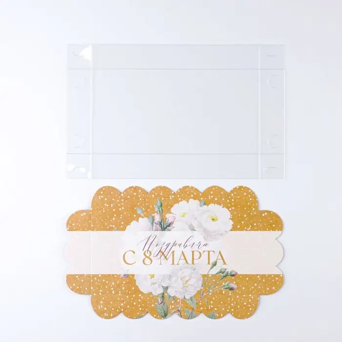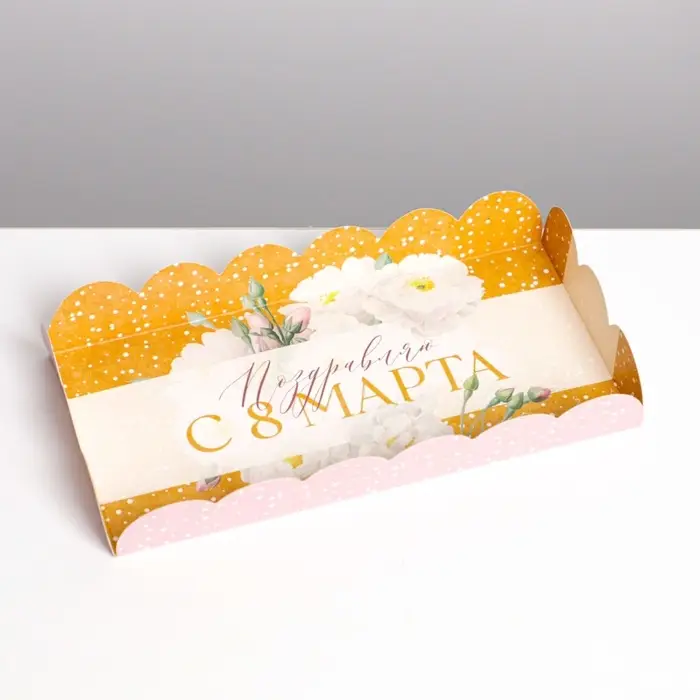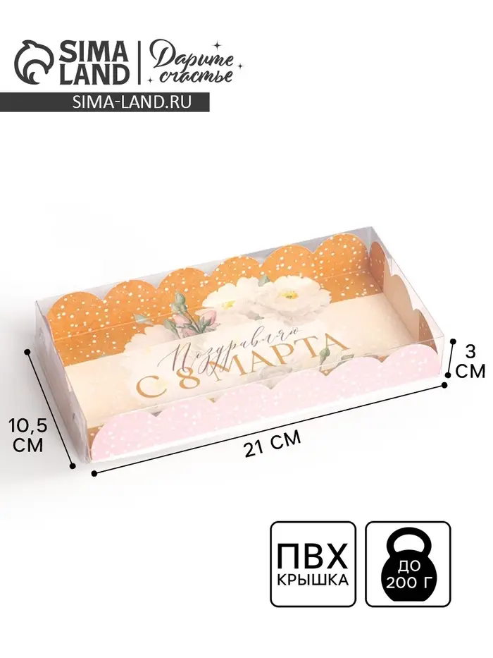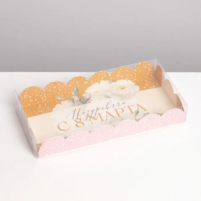 Коробка для печенья, кондитерская упаковка с пластиковой крышкой, «8 марта», 10.5 х 21 х 3 см