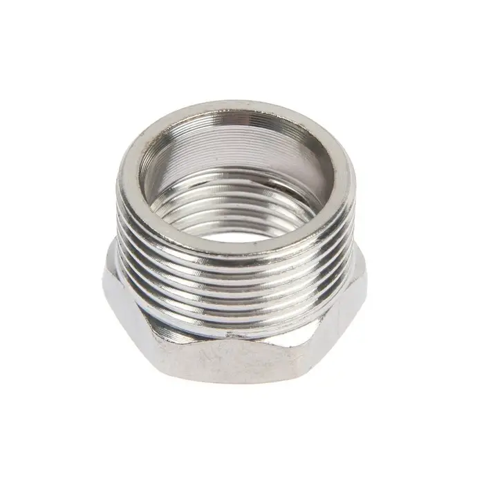 Изделие имеет наружную и внутреннюю резьбу. Головка фитинга насчитывает шесть граней, поэтому вкручивание футорки производится гаечным ключом.