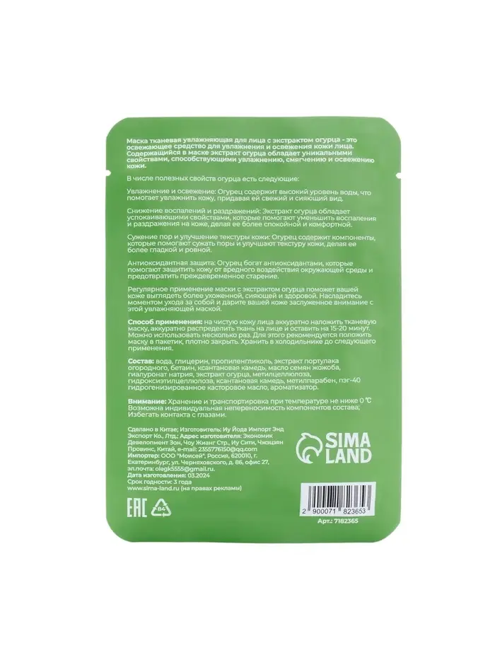 Тканевая маска для лица на основе экстракта огурца, который содержит полисахариды, витамины, энзимы, минералы, микроэлементы и эффективно увлажняет кожу, оказывает антиоксидантное действие, успокаивает, осветляет, избавляет её от жирного блеска, тонизирует увядающую и уставшую кожу, а также обладает регенерирующими свойствами.