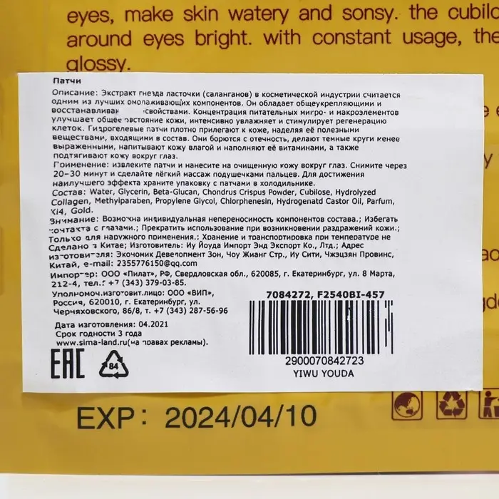 Гидрогелевые патчи плотно прилегают к коже, наделяя её полезными веществами, входящими в состав. Они борются с отечностью, делают темные круги менее выраженными, напитывают кожу влагой и наполняют её витаминами. Вытяжка из гнезда птиц очень полезное вещество, богатое йодом, железом, кальцием, фосфором, аминокислотами и другими полезными веществами. Этот компонент повышает иммунитет, усиливает защитные функции, обновляет и омолаживает кожу.