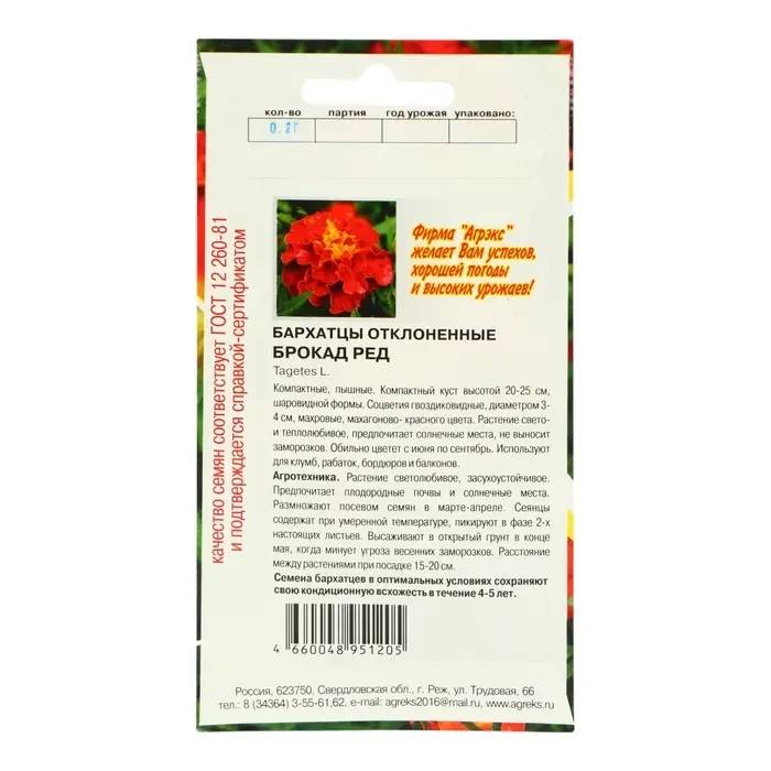 Семена Цветов однолетние Бархатцы "Брокад Ред",отклонённые, махровые, 0,2 г