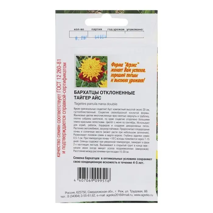Семена Цветов однолетние Бархатцы Тайгес Айс", отклонённые, махровые, 0,2 г