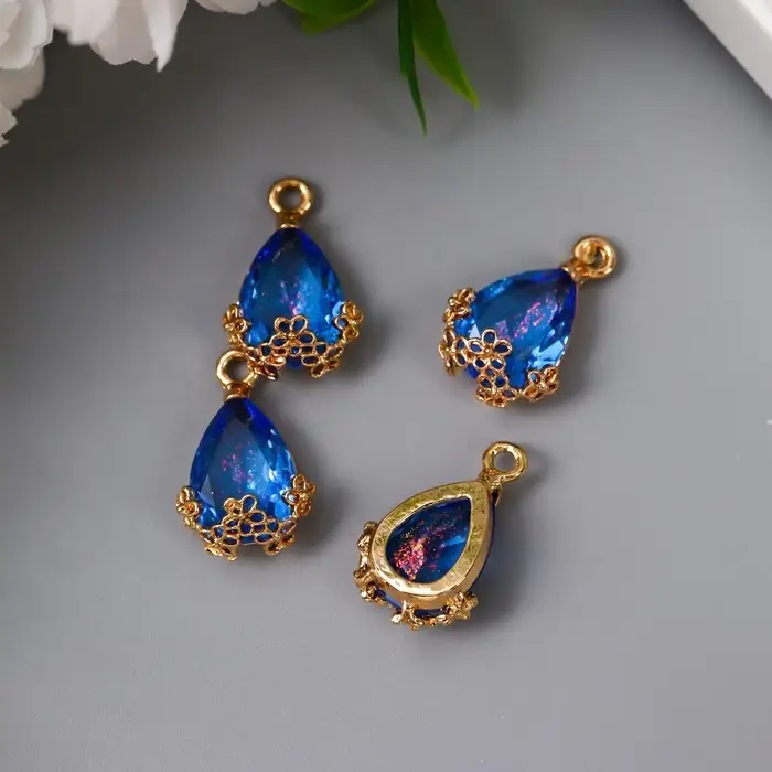Декор для творчества пластик "Капля с золотыми цветочками" синий кристалл 2х1,2 см