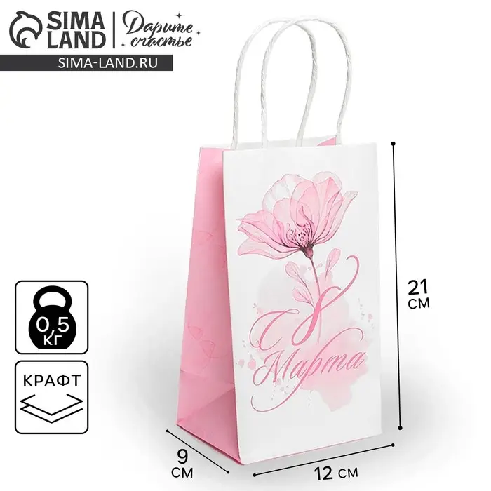 Пакет подарочный крафтовый, упаковка, «8 марта», 12 х 21 х 9 см