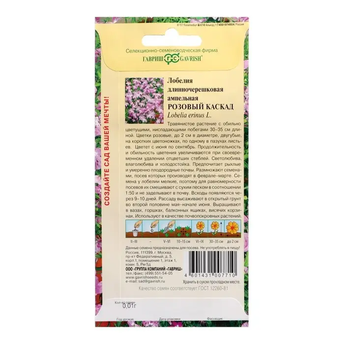 Семена цветов Лобелия ампельная "Розовый каскад", ц/п, 0,01 г