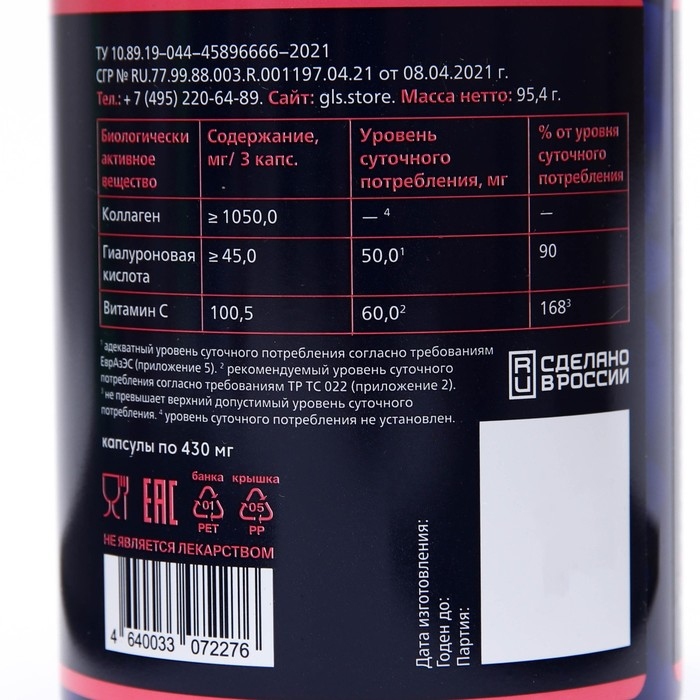 Состав: 3 вегетарианские капсулы (суточная доза) содержат: гидролизат рыбного коллагена – 1050 мг, гиалуроновая кислота – 45 мг, аскорбиновая кислота - 100,5 мг.