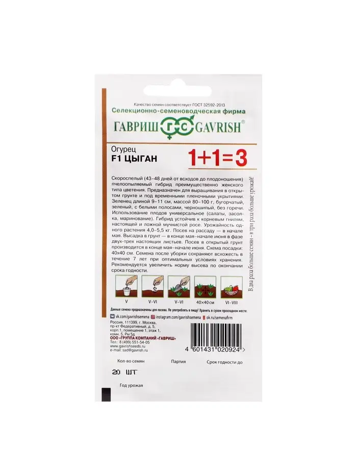 Семена Огурец "Цыган F1", серия 1+1, 20 шт