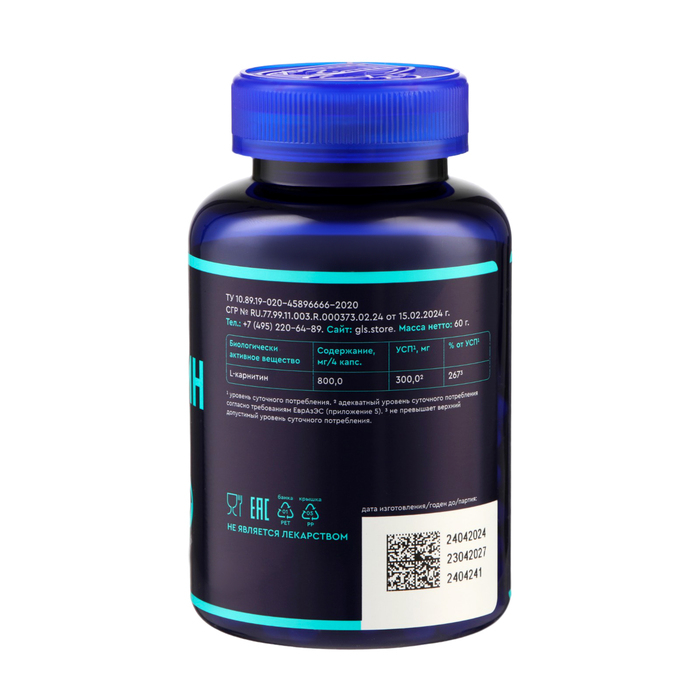 L-карнитин 800 GLS Pharmaceuticals, сжигание жира и физическая выносливость, 120 капсул по 400 мг