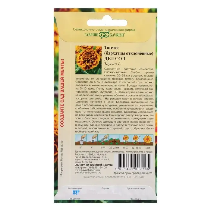 Семена цветов Бархатцы отклоненные (Тагетес) "Дел Сол", ц/п, 0,3 г
