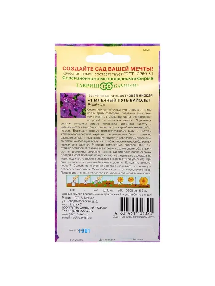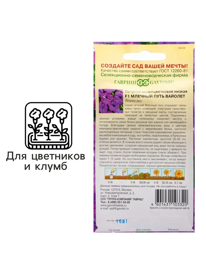 Серия петуний "Млечный путь" открывает тайны новых ярких созвездий, очертания таинственных галактик, и звездные карты составленных природой на лепестках цветов. Подчиняясь земным условиям, живые «телескопы» изменяют частоту и интенсивность своих белых рисунков при жаркой или меняющейся погоде. Благодаря своему привлекательному виду и цветкам жемчужно-фиолетовой окраски с вкраплением белых, хаотично расположенных пятнышек станут поистине королевским украшением любой композиции в саду, на клумбах, подоконниках, балконных ящиках или вазонах. Растения компактные, высотой 30-35 см, отлично ветвятся. В течение всего сезона радуют своим обильным и долгим цветением, сохраняя прекрасный вид даже после сильных дождей. Посев проводят поверхностно, не заделывая, с февраля по март, под стекло (после появления всходов стекло убирают). При зимнем посеве всходам необходима подсветка. Всходы появляются через 7-12 дней. На постоянное место высаживают, когда минует опасность заморозков. Светолюбива и достаточно засухоустойчива. Предпочитает легкие, плодородные, хорошо дренированные почвы.