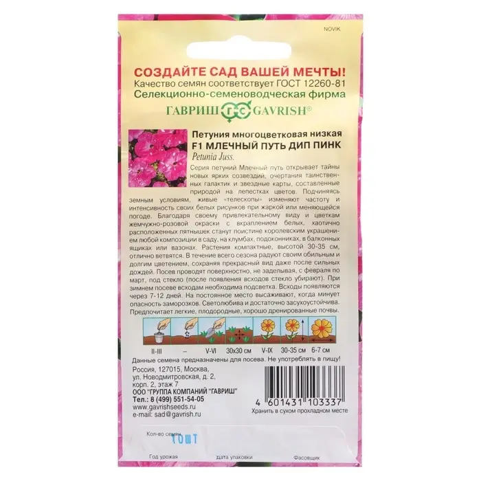 Серия петуний "Млечный путь" открывает тайны новых ярких созвездий, очертания таинственных галактик, и звездные карты составленных природой на лепестках цветов. Подчиняясь земным условиям, живые «телескопы» изменяют частоту и интенсивность своих белых рисунков при жаркой или меняющейся погоде. Благодаря своему привлекательному виду и цветкам жемчужно-розовой окраски с вкраплением белых, хаотично расположенных пятнышек станут поистине королевским украшением любой композиции в саду, на клумбах, подоконниках, балконных ящиках или вазонах. Растения компактные, высотой 30-35 см, отлично ветвятся. В течение всего сезона радуют своим обильным и долгим цветением, сохраняя прекрасный вид даже после сильных дождей. Посев проводят поверхностно, не заделывая, с февраля по март, под стекло (после появления всходов стекло убирают). При зимнем посеве всходам необходима подсветка. Всходы появляются через 7-12 дней. На постоянное место высаживают, когда минует опасность заморозков. Светолюбива и достаточно засухоустойчива. Предпочитает легкие, плодородные, хорошо дренированные почвы.