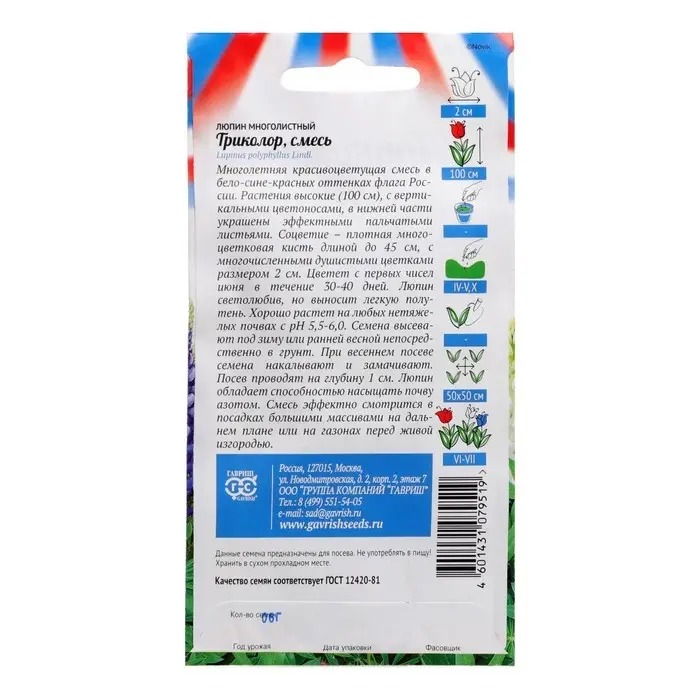 Многолетняя красивоцветущая смесь в бело-сине-красных оттенках флага России. Растения высокие (100 см), с вертикальными цветоносами, в нижней части украшены эффектными пальчатыми листьями. Соцветие–плотная, многоцветковая кисть длиной до 45 см, с многочисленными душистыми цветками размером 2 см. Цветет с первых чисел июня в течение 30-40 дней. Люпин светолюбив, но выносит легкую полутень. Хорошо растет на любых нетяжелых почвах с рН 5,5-6,0. Семена высевают под зиму или ранней весной непосредственно в грунт. Смесь эффектно смотрится в посадках большими массивами на дальнем плане или на газонах перед живой изгородью.