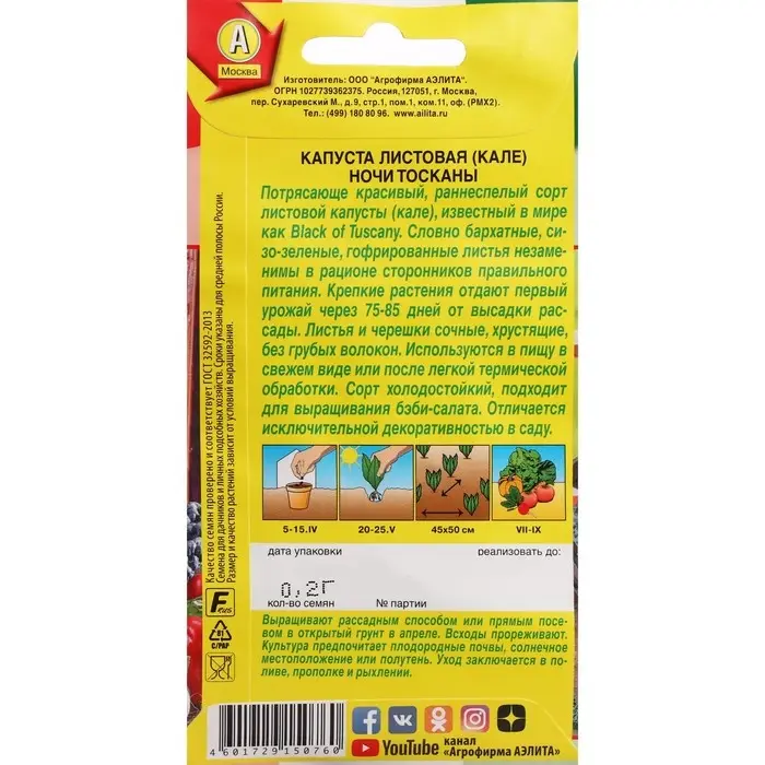 Потрясающе красивый, раннеспелый сорт листовой капусты (кале), известный в мире как Black of Tuscany. Словно бархатные, сизо-зеленые, гофрированные листья незаменимы в рационе сторонников правильного питания. Крепкие растения отдают первый урожай через 75-85 дней от высадки рассады. Листья и черешки сочные, хрустящие, без грубых волокон. Используются в пищу в свежем виде или после легкой термической обработки. Сорт холодостойкий, подходит для выращивания бэби-салата. Отличается исключительной декоративностью в саду.