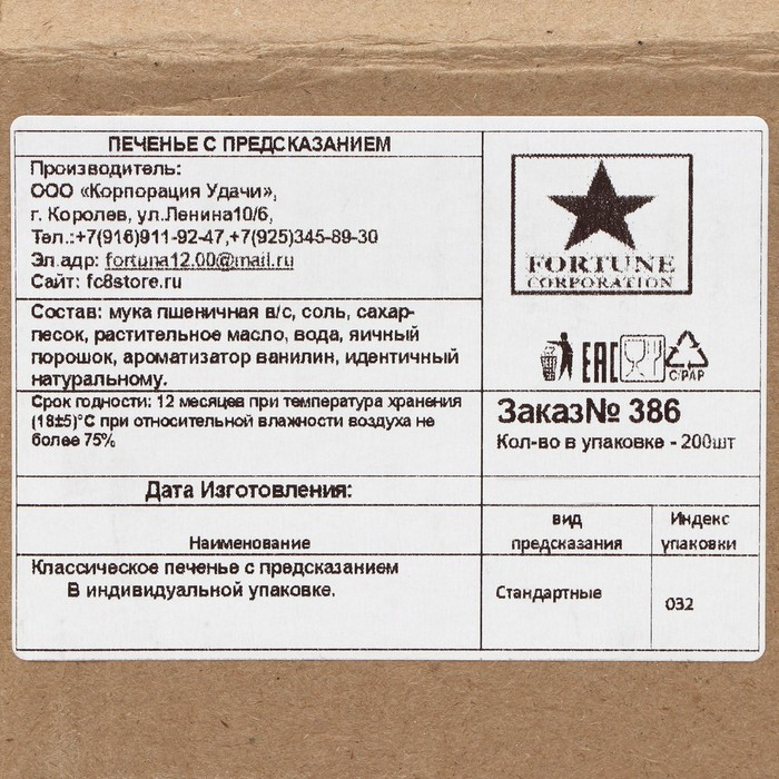 Печенье песочное с предсказаниями "Стандарт", 200 шт., 1200 г