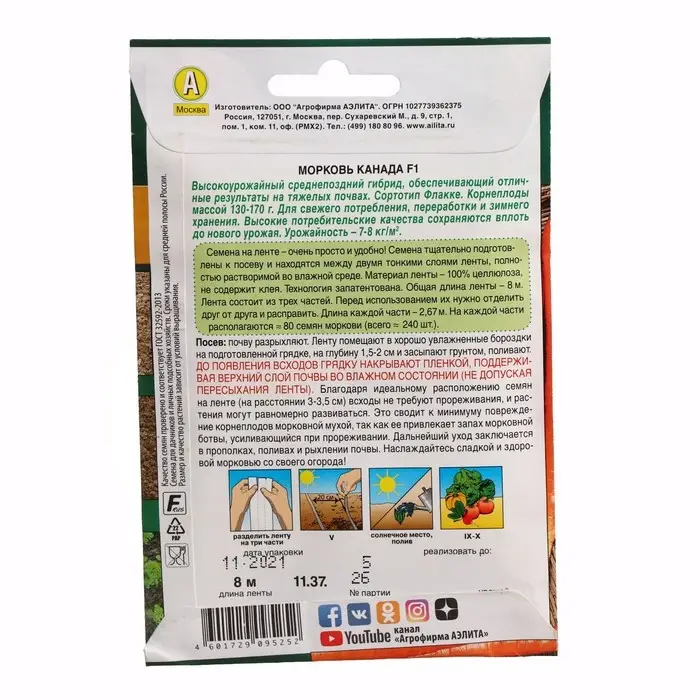 Семена на ленте – очень просто и удобно! Семена тщательно подготовлены к посеву и находятся между двумя тонкими слоями ленты, полностью растворимой во влажной среде. Материал ленты – 100% целлюлоза, не содержит клея. Технология запатентована. Общая длина ленты – 8 м. Лента состоит из трех частей. Перед использованием их нужно отделить друг от друга и расправить. Длина каждой части – 2,67 м. На каждой части располагаются ≈ 80 семян моркови (всего ≈ 240 шт.).