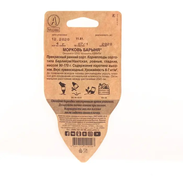 Раннеспелый сорт, период от всходов до технической спелости 90-95 дней. Корнеплоды ровные, гладкие, (сортотип Нантская) с маленькой сердцевиной, длиной 20-25 см, с высоким содержанием каротина и прекрасными вкусовыми качествами. Масса товарного корнеплода 250-270 г. Средняя урожайность – 6-7 кг/м2. Сорт гармонично сочетает высокую урожайность, устойчивость к растрескиванию корнеплодов и цветушности. Рекомендуется к выращиванию в самых различных климатических зонах. Посев семян в бороздки на глубину 1,5-2,0 см. До появления всходов посевы рекомендуем укрыть пленкой для сохранения оптимальной влажности почвы. С развитием первых двух пар настоящих листочков растения прореживают. Второе прореживание проводят, когда корнеплоды достигнут диаметра 1 см. Возможен подзимний посев (в конце октя-бря – начале ноября) на глубину 3 см.