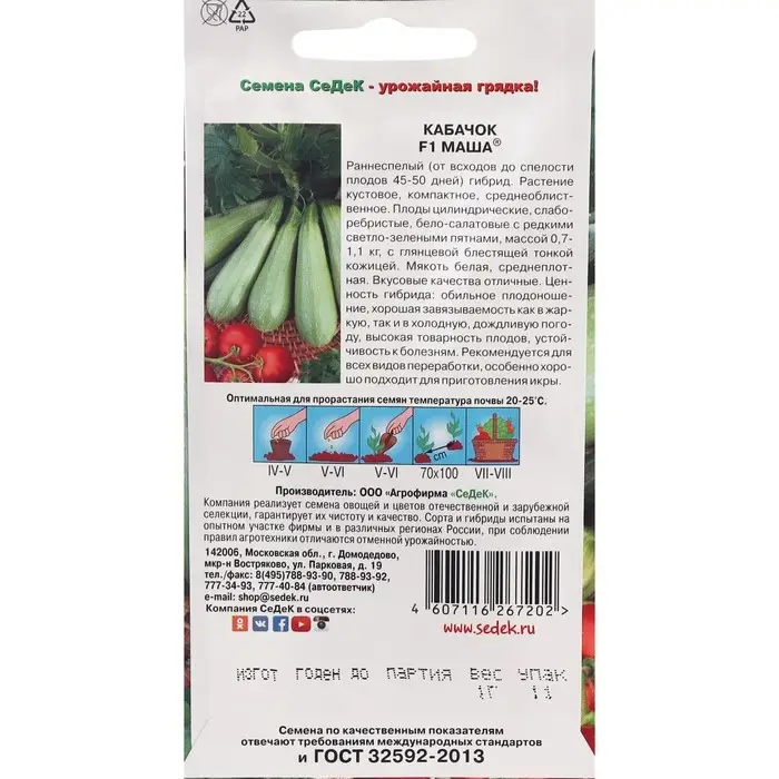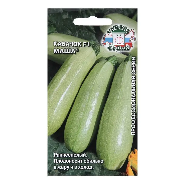 Раннеспелый (от всходов до спелости плодов 45-50 дней) гибрид. Растение кустовое, компактное, среднеоблиственное. Плоды цилиндрические, слабо- ребристые, бело-салатовые с редкими светло-зелеными пятнами, массой 0,7-1,1 кг с глянцевой блестящей тонкой кожицей. Мякоть белая, среднеплотная. Вкусовые качества отличные. Ценность гибрида: обильное плодоношение, хорошая завязываемость как в жаркую, так и вхолодную, дождливую погоду, высокая товарность плодов, устойчивость к болезням. Рекомендуется для и всех видов переработки, особенно хорошо подходит для приготовления икры.