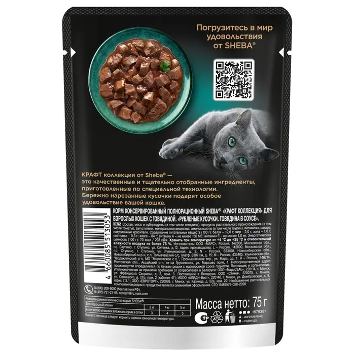 Влажный корм Sheba Craft для кошек, говядина, соус, пауч, 75 г